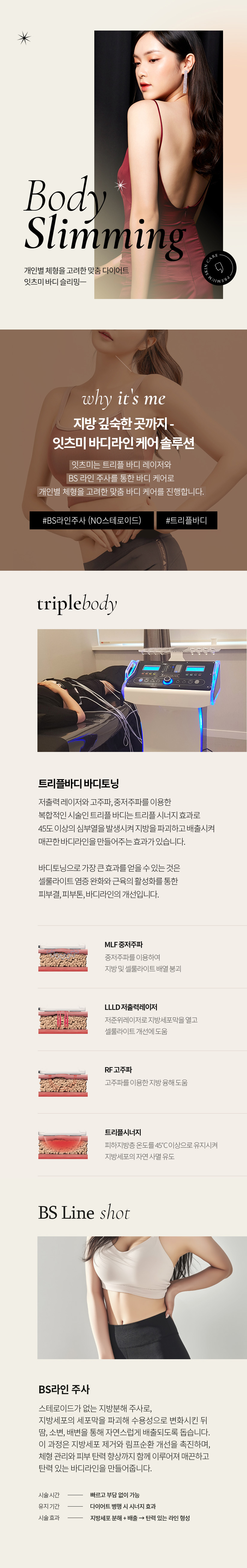 트리플바디는 고주파 전류가 인체 내에 전달되는 열로 지방을 녹여내고 파괴하여 체내 지방을 감소시킵니다. 약 20분의 시술로 마라톤 2시간을 뛴 칼로리 소모 효과를 누리실 수 있습니다.