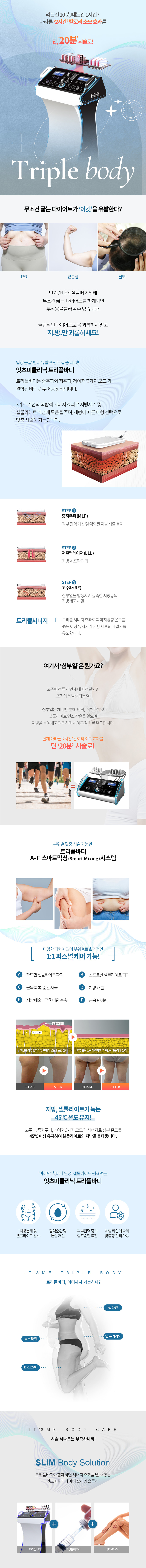 잇츠미의원 트리플바디는 고주파 전류가 인체 내에 전달되는 열로 지방을 녹여내고 파괴하여 사이즈를 감소시키며, 약 20분의 시술로 마라톤 2시간을 뛴 소모 효과를 누릴 수 있습니다.